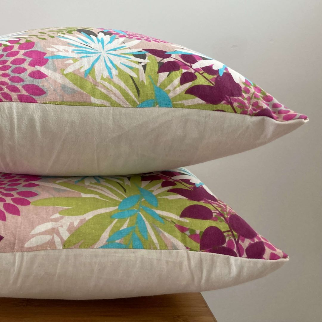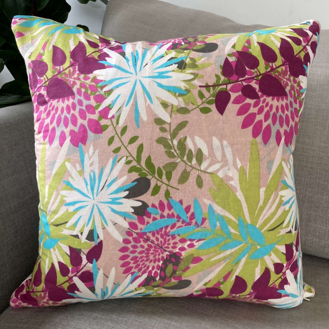 A beautiful floral cushion in purples and greens.